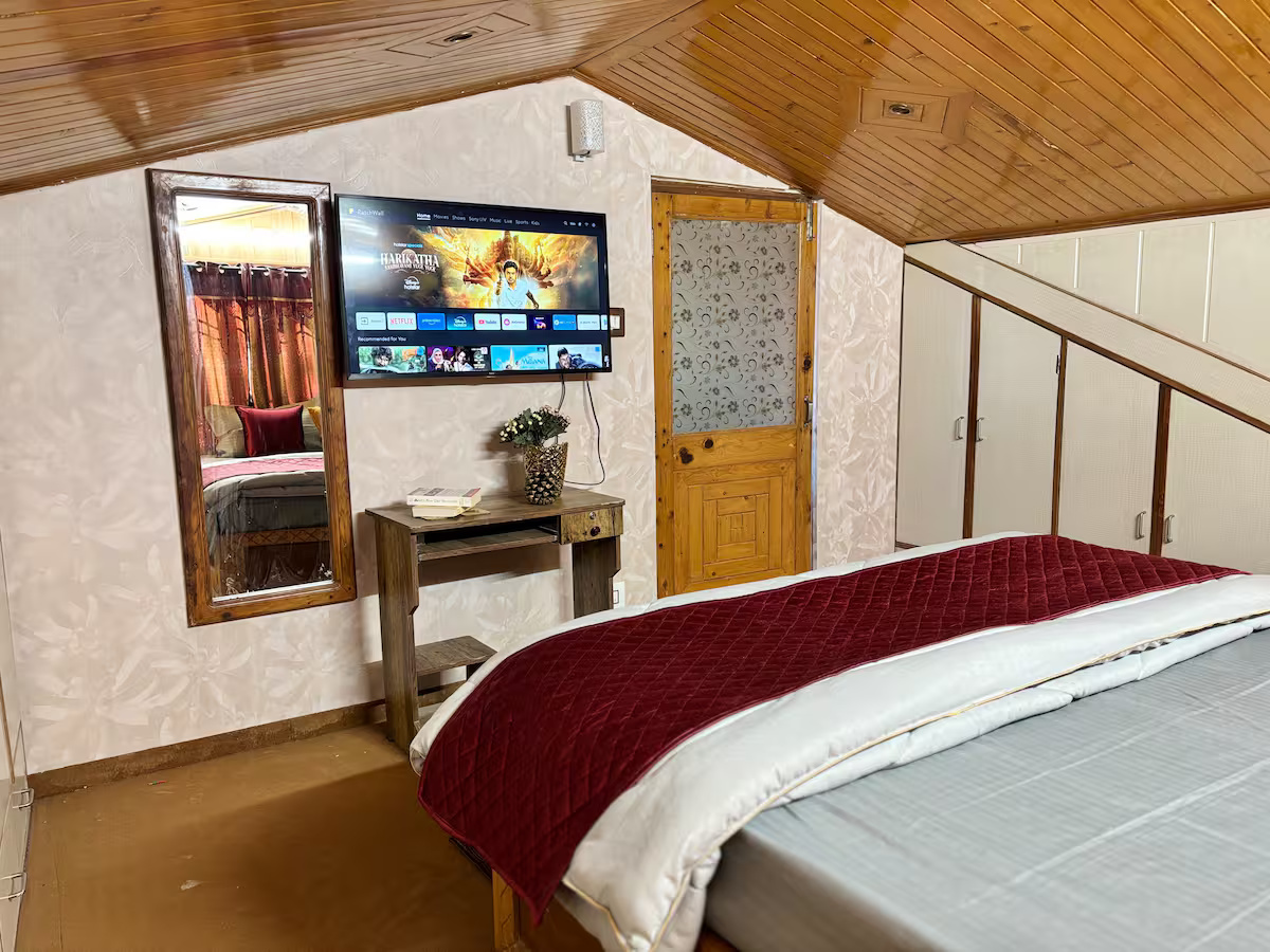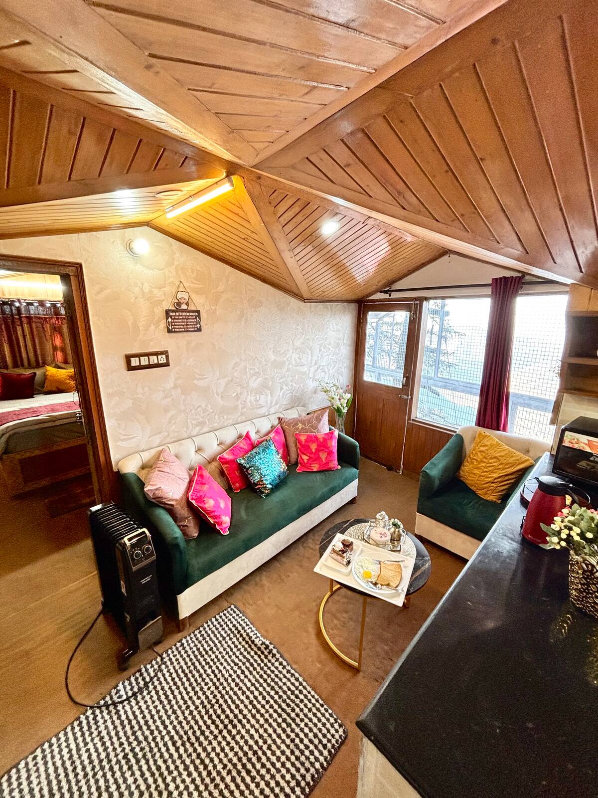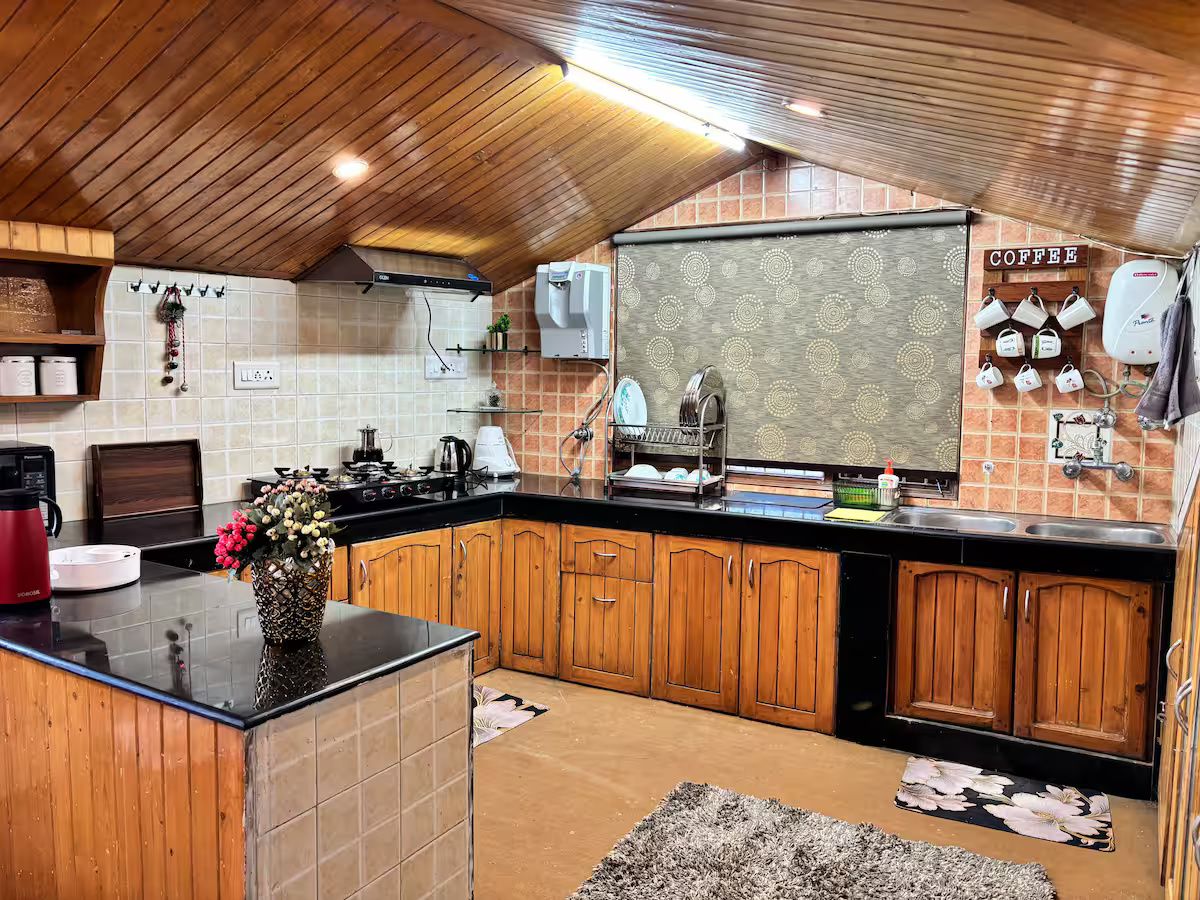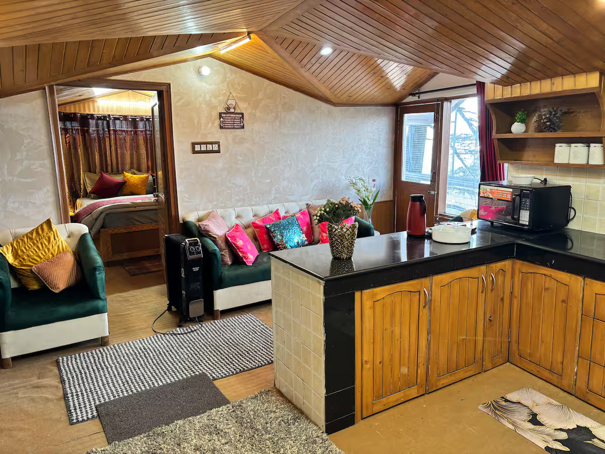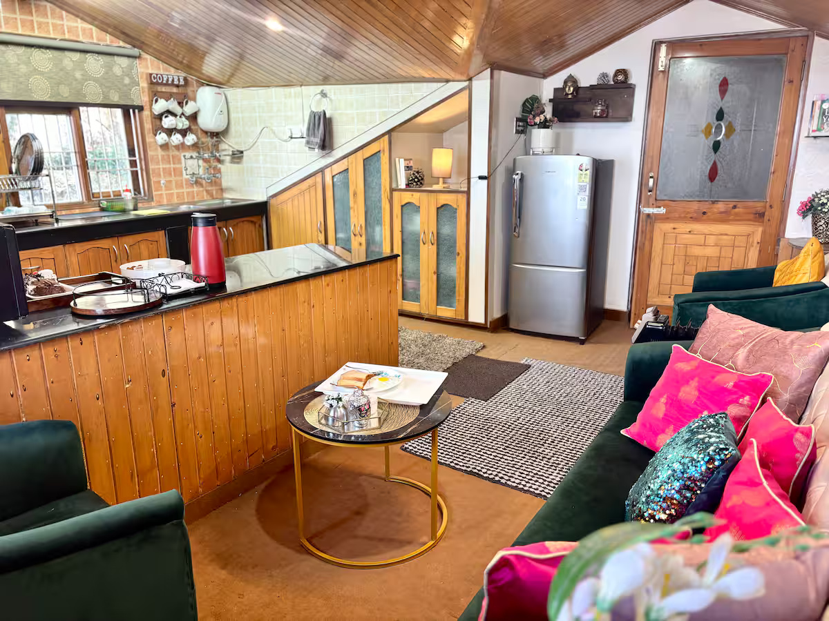 Your stay at Jakhoo Nest Tiny House (2) includes a fully equipped dry kitchen with a microwave, refrigerator, RO water, electric kettle, and complimentary tea and coffee sachets. Enjoy a cozy living area with a smart TV (Netflix, Prime Video, etc.), high-speed Wi-Fi, and customised wooden furniture. The house offers 24-hour water supply, geysers, clean towels, shampoo, soap, and a comfortable sleeping arrangement with two king-size beds and one single bed. One room heater is provided free of charge; additional heaters are available at ₹200 per day. Daily housekeeping is included, and the caretaker can help with cooking using your own groceries.