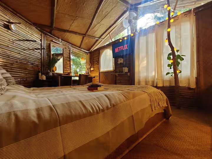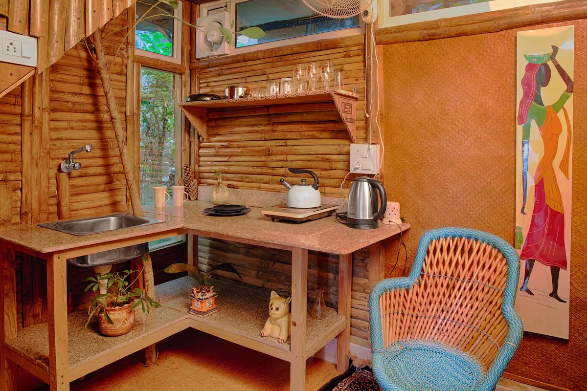 Wanderthirst Dharamshala is an experience you can never get in any hotel or resort. It’s one of the most unique properties in Himachal—set in a picturesque corner of Dharamshala with a little jungle vibe. This duplex tiny home has a cozy living area, a kitchenette, and a washroom on the ground floor. Upstairs, you'll find a bedroom, a workspace-cum-dressing table, and a cute balcony perfect for your morning coffee. If your shade is green, this is the place to be—surrounded by immense greenery and positivity.