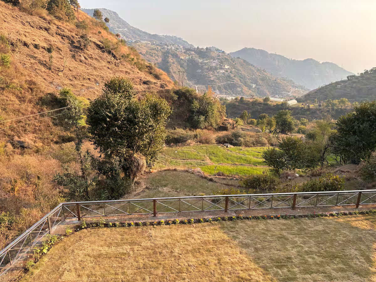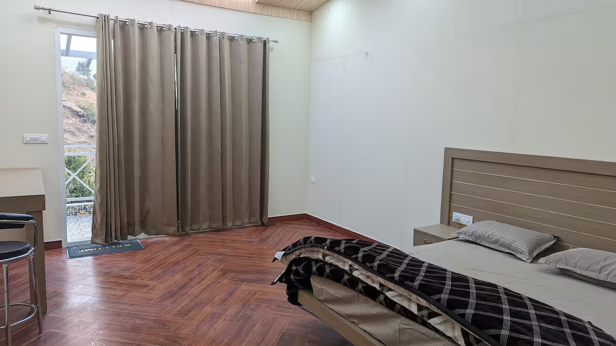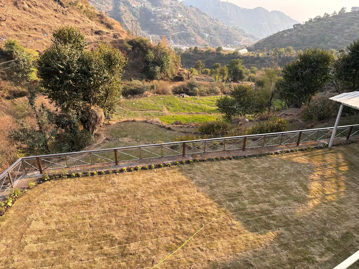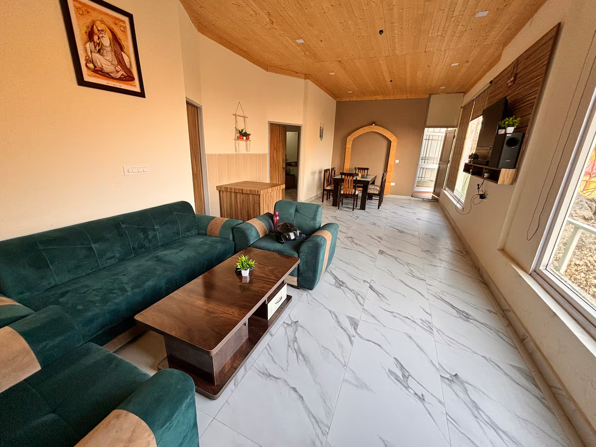Raha Cottage features three spacious bedrooms with king-size beds and attached bathrooms, all located on the first floor, offering stunning views of the surrounding mountains and valley. The ground floor houses a warm and inviting living room with a TV, books, comfortable seating, and fixed Bluetooth speakers—ideal for relaxing or bonding with loved ones. A fully equipped indoor kitchen allows guests to cook their own meals, or request assistance from the caretaker for a small fee. Outdoors, the private garden provides a perfect setting for al fresco dining, bonfire nights, and games. With thoughtful amenities like Wi-Fi, power backup, private parking, and pet-friendly outdoor space, Raha Cottage ensures a relaxing and fulfilling hill-station escape.