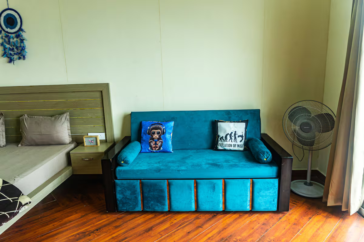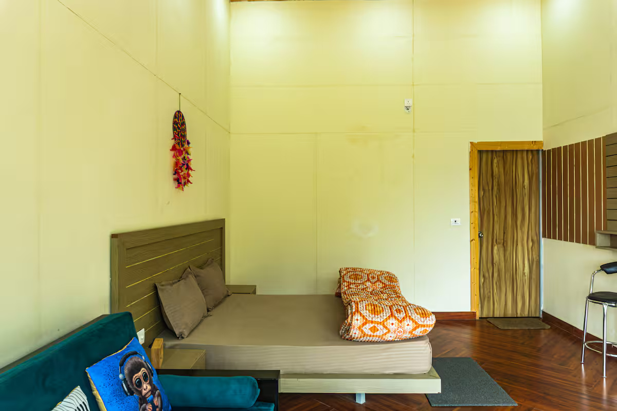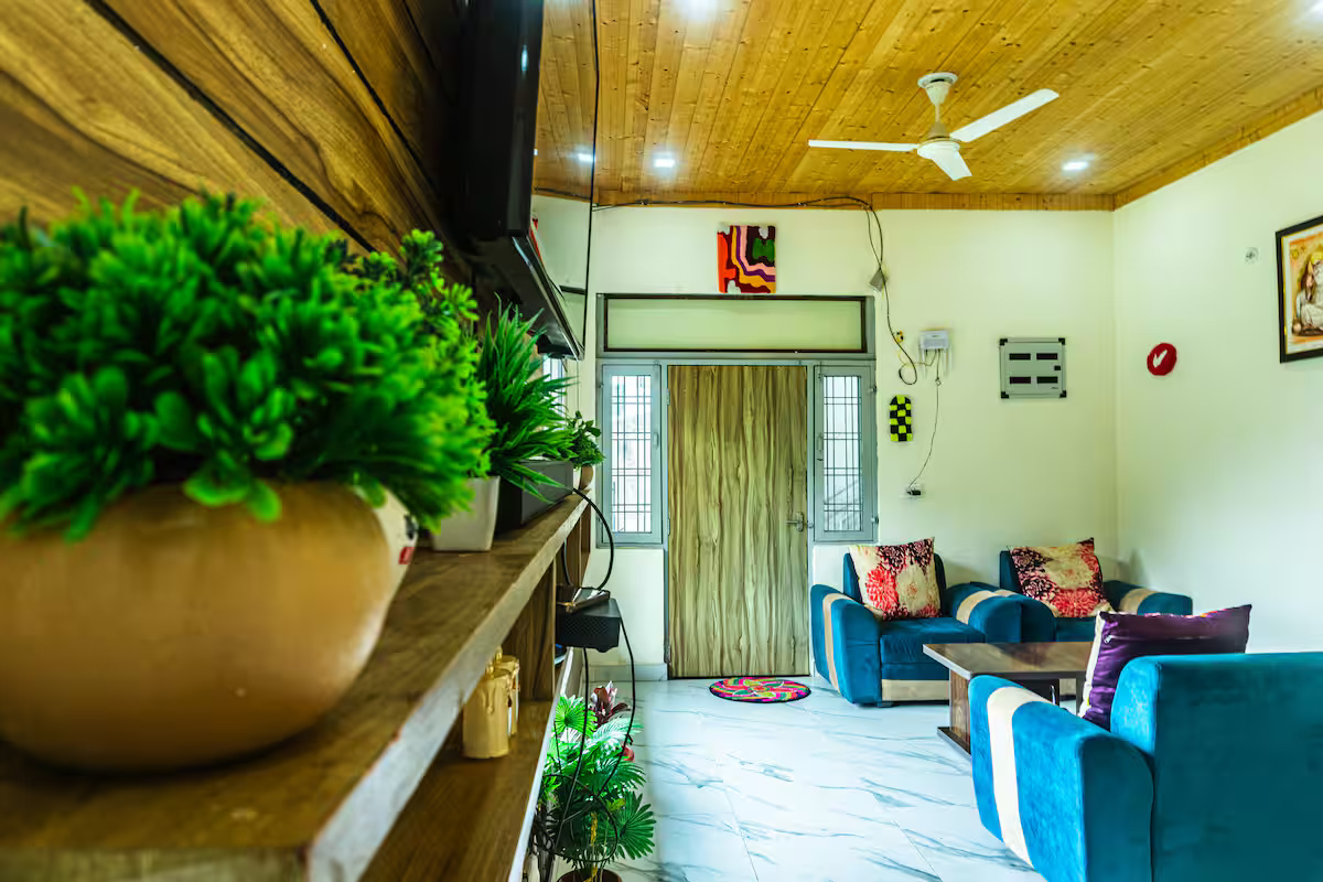 Your stay at Raha Cottage includes access to the entire property—three bedrooms, a cozy living area, a full kitchen, and a private garden. All bedrooms come with king-size beds, attached bathrooms, and views. Bathrooms are equipped with geysers, towels, and a toiletry dispenser, with extras available on request. The kitchen includes a gas stove, refrigerator, microwave, utensils, RO water, and basic spices. Guests also enjoy high-speed Wi-Fi (100 Mbps), parking for 4–5 cars, ceiling fans, water coolers, and heaters in winter. A caretaker and cleaning staff are available on-site for assistance, and inverter backup ensures comfort during power cuts.
