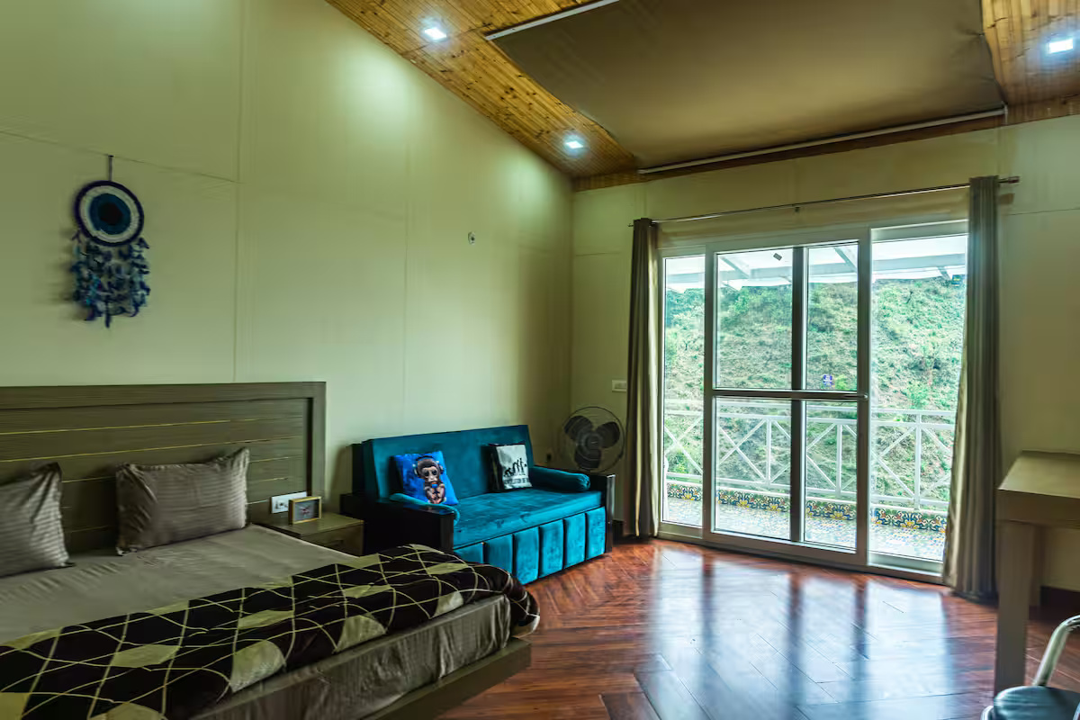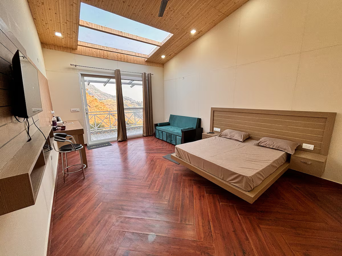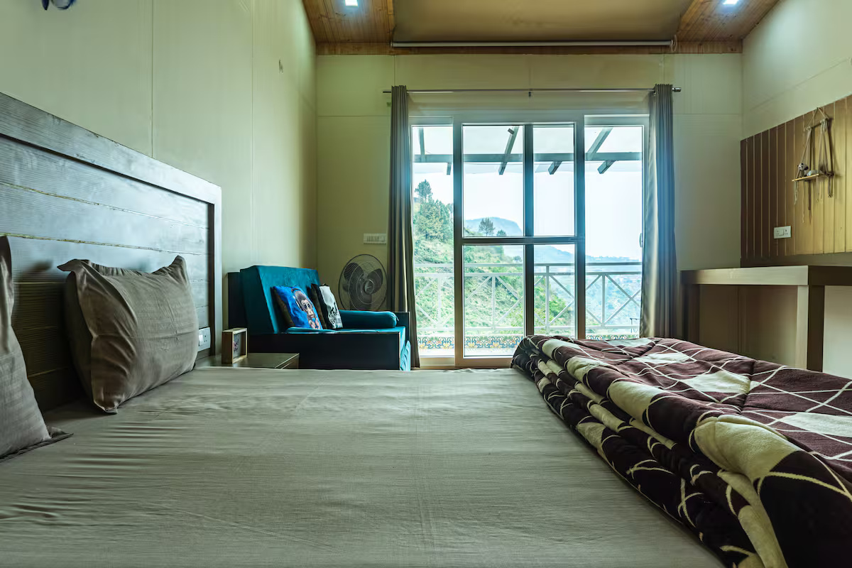 Includes 1 king-size bed, a private attached bathroom with a geyser and shower, and large windows that open to mountain and valley views.