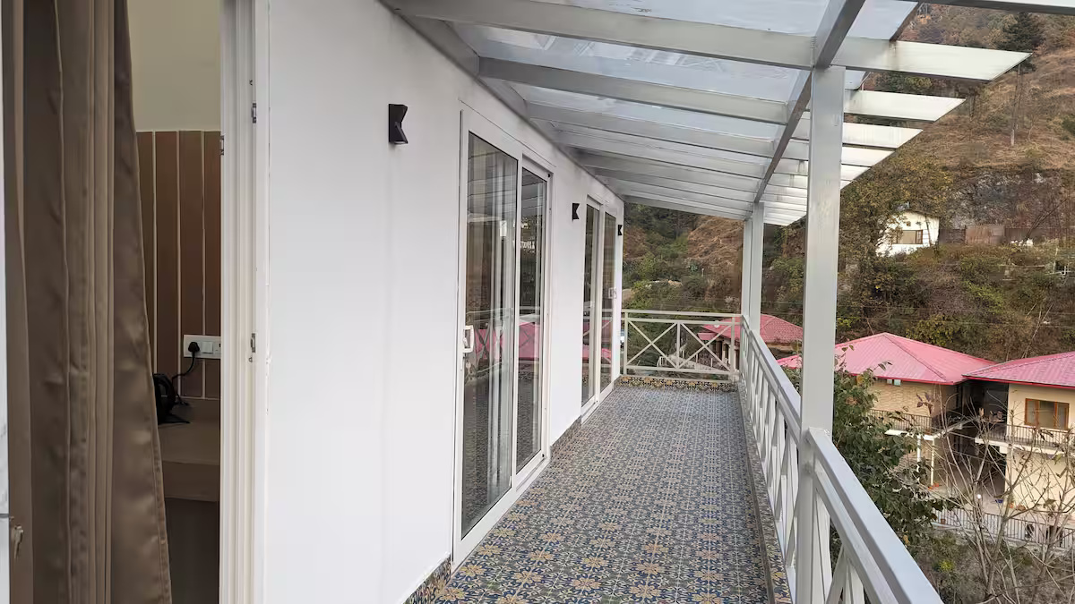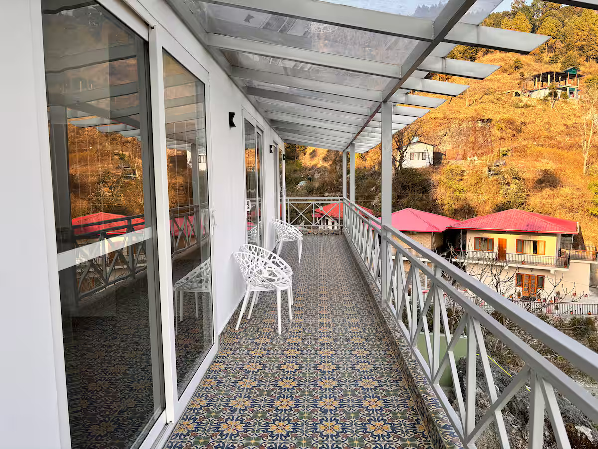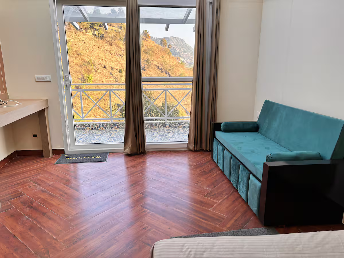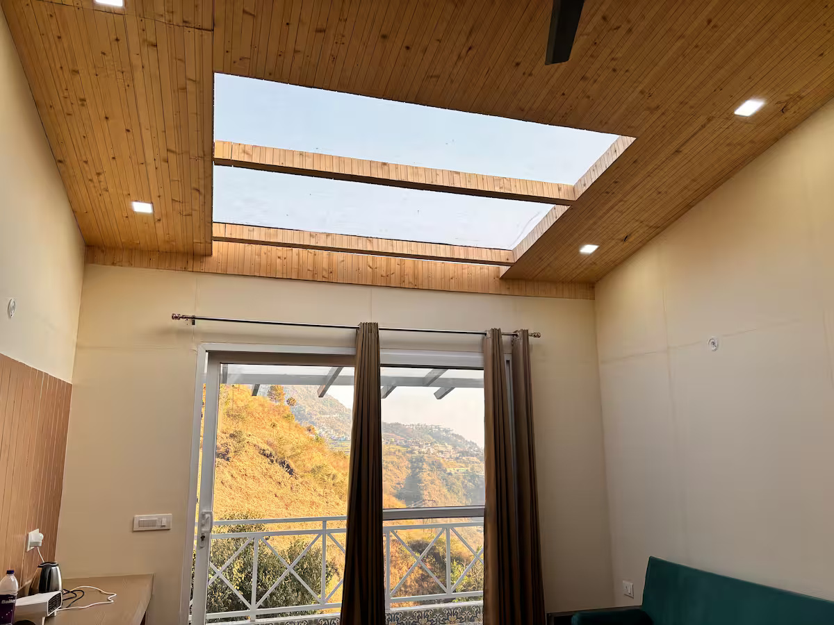 Includes 1 king-size bed, a private attached bathroom with a geyser and shower, and large windows that open to mountain and valley views.