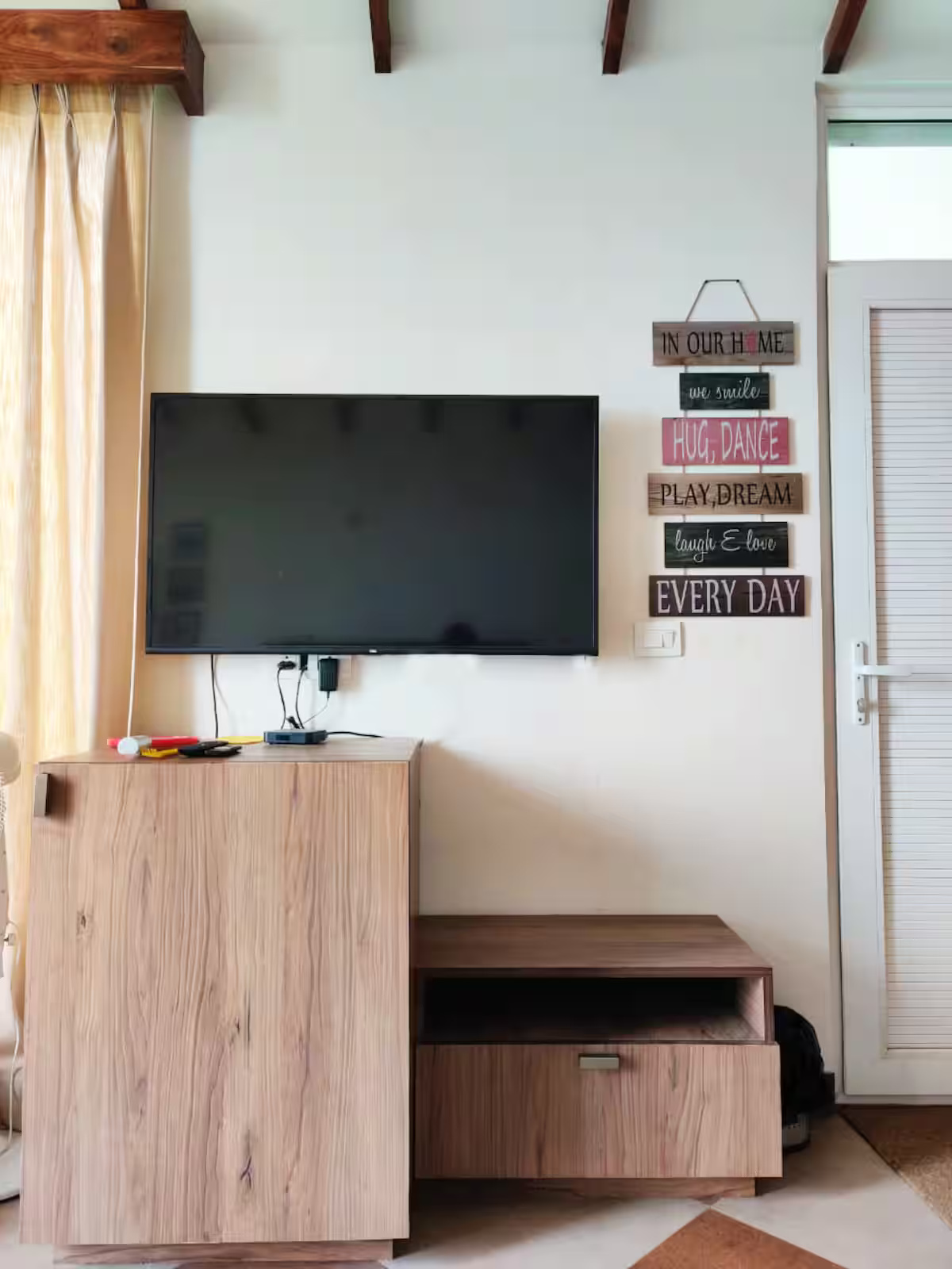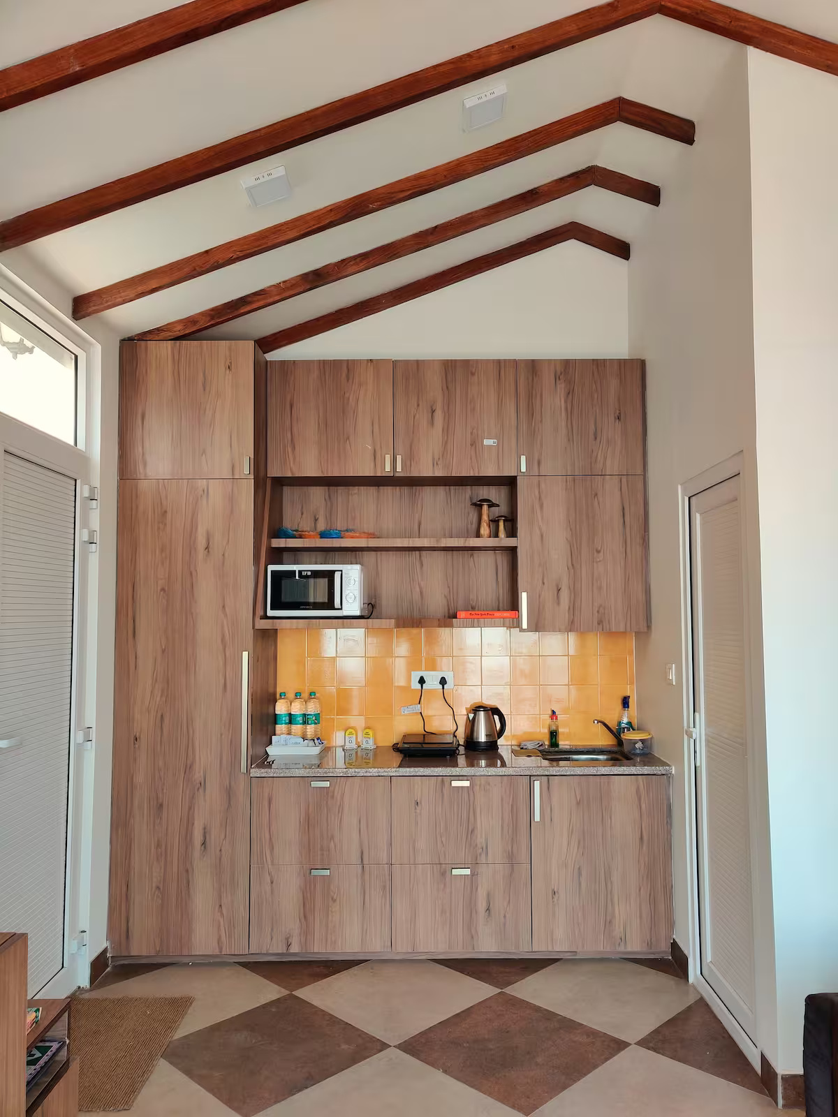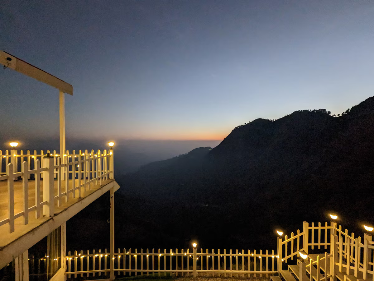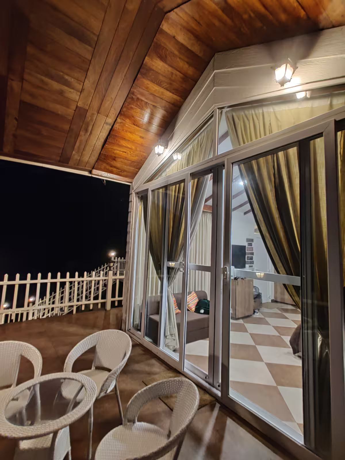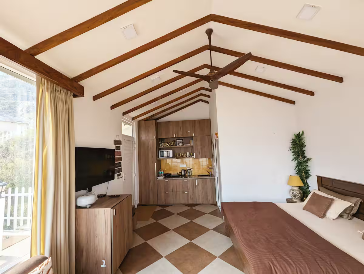 The stay includes full access to the entire property with two private bedrooms, each with attached washrooms. Amenities provided are fresh linens, quilts, blankets, room heaters, and free Wi-Fi. One bedroom features a kitchenette equipped with a mini fridge, microwave, induction cooktop, and basic utensils. Entertainment options include a 52" TV and cosy seating spaces. You'll also find a sofa cum bed in both rooms, cupboards for storage, an electric kettle, and a large open deck with outdoor furniture – all designed to ensure a comfortable and memorable stay in the mountains.