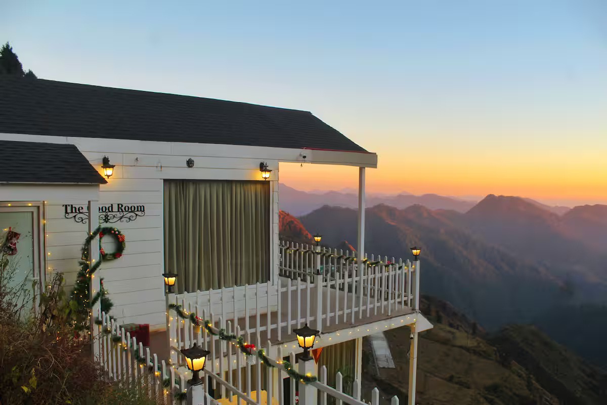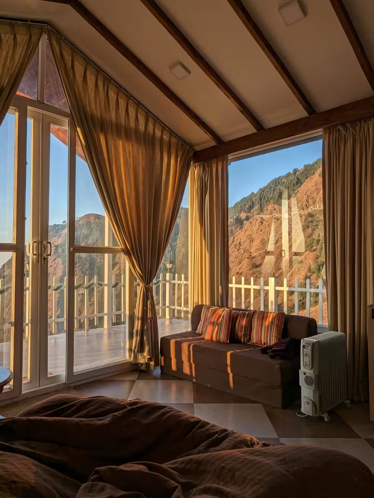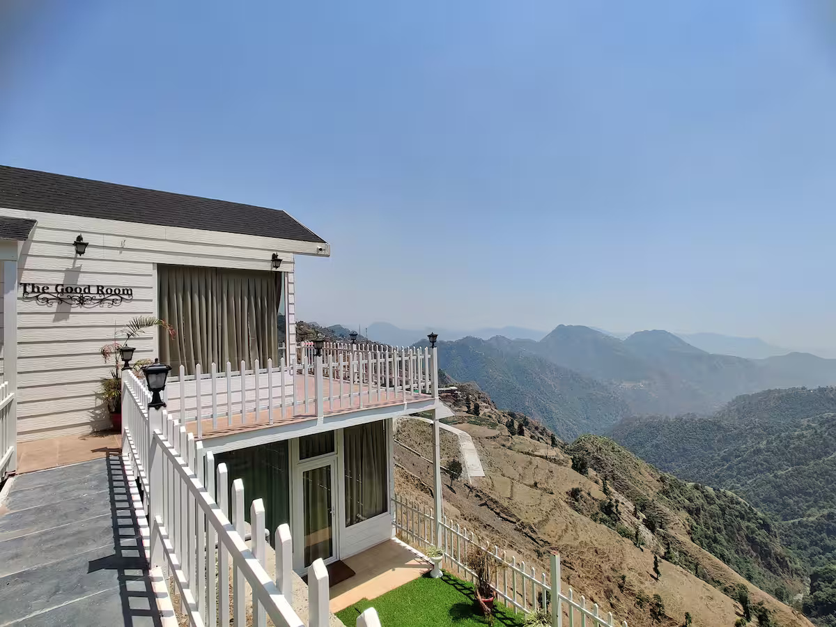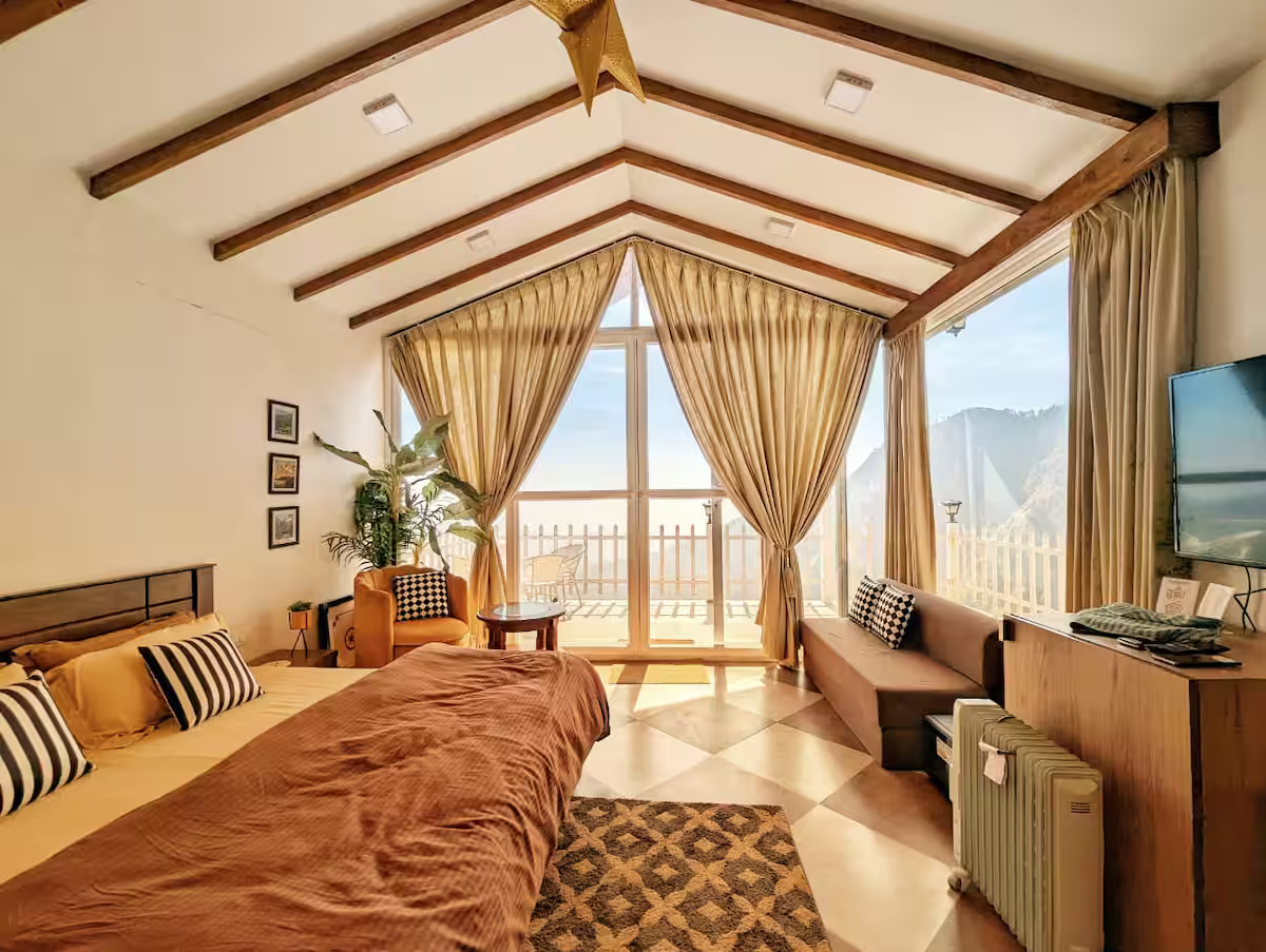 This dreamy mountain home features two spacious bedrooms, each with attached washrooms and beautiful views. The first bedroom includes a kitchenette with a mini fridge, microwave, and induction, along with a 52" TV, Wi-Fi, a cosy sofa cum bed, and a private open deck with outdoor seating. The second room offers a serene mountain valley view, double bed, sofa cum bed, and an electric kettle. Both rooms are equipped with quilts, blankets, and room heaters. Guests have full, private access to the entire space without any interruptions.