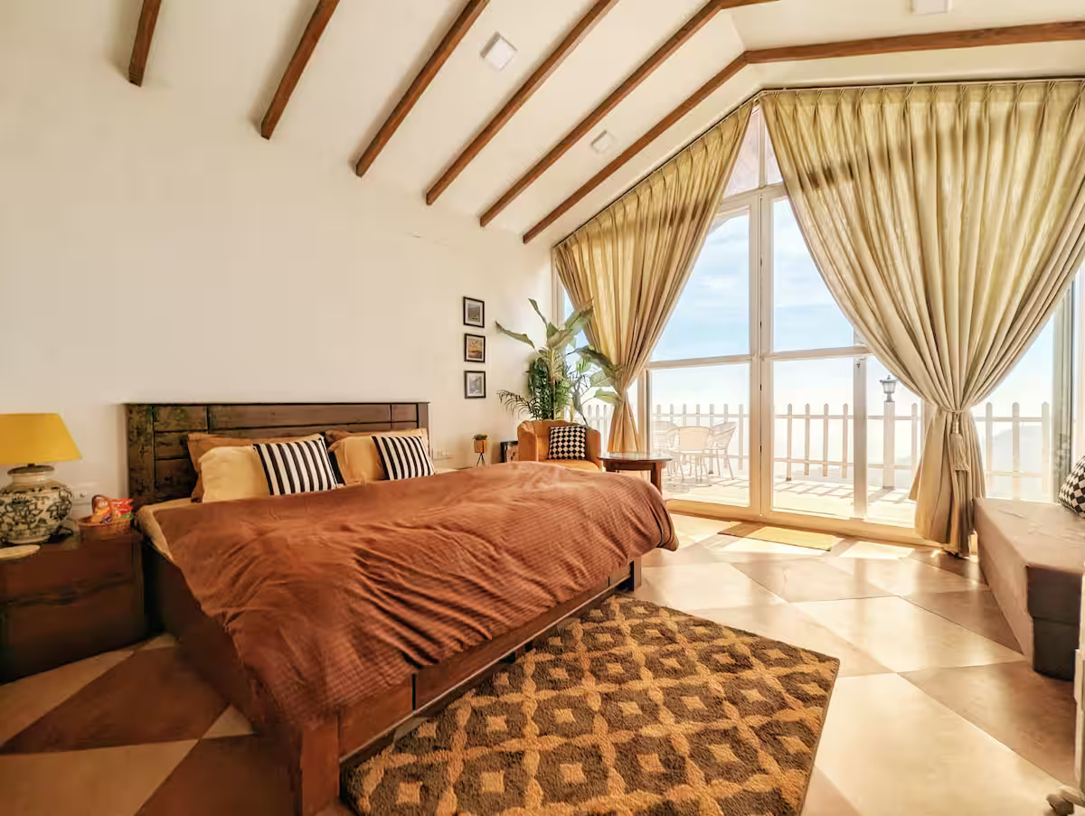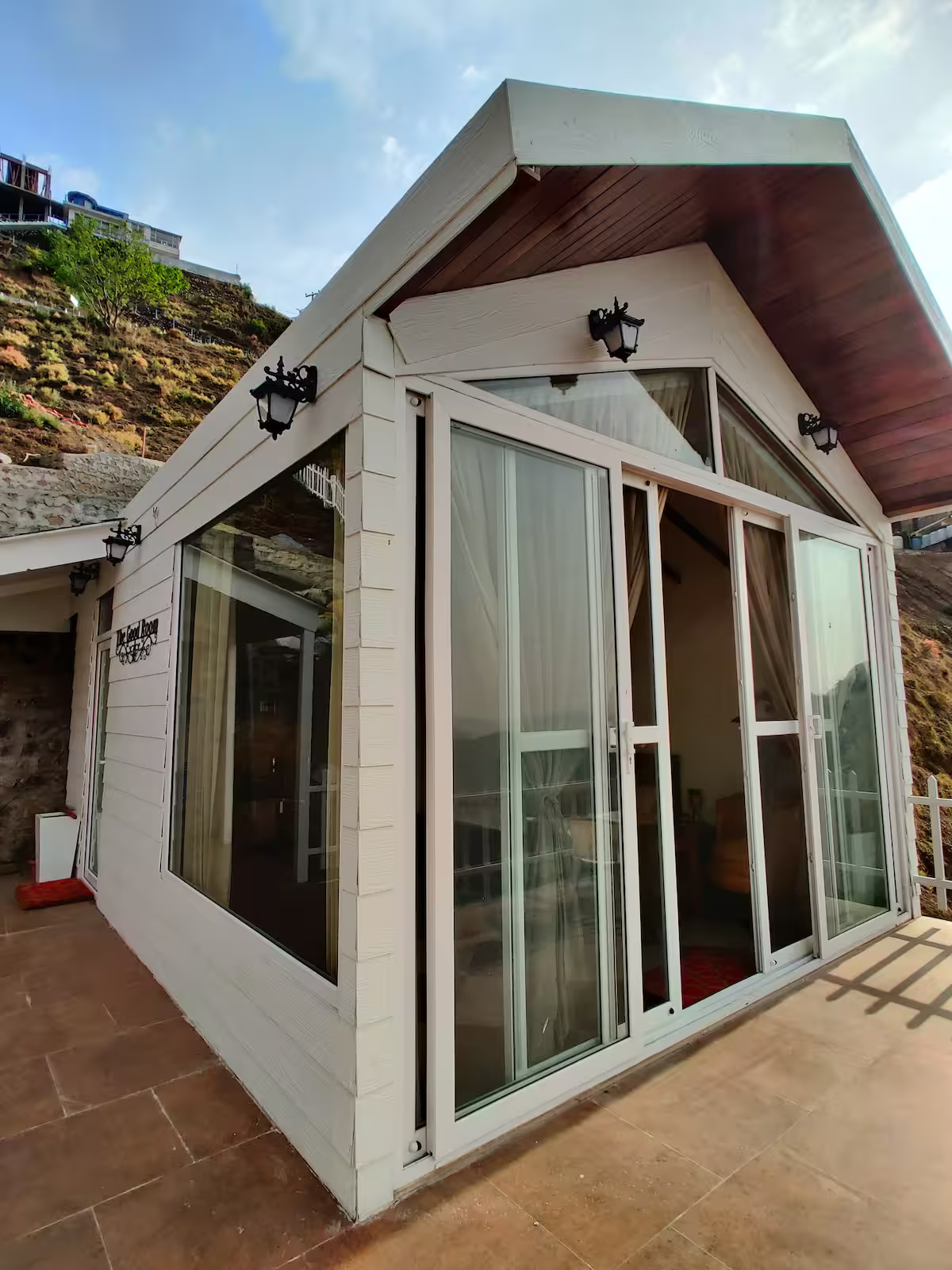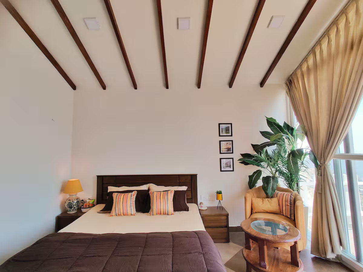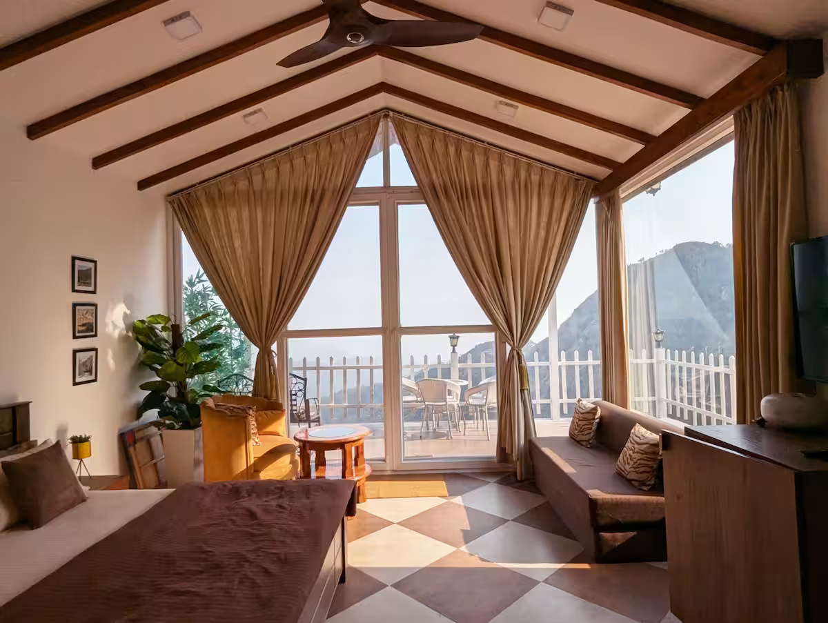 This dreamy mountain home features two spacious bedrooms, each with attached washrooms and beautiful views. The first bedroom includes a kitchenette with a mini fridge, microwave, and induction, along with a 52" TV, Wi-Fi, a cosy sofa cum bed, and a private open deck with outdoor seating. The second room offers a serene mountain valley view, double bed, sofa cum bed, and an electric kettle. Both rooms are equipped with quilts, blankets, and room heaters. Guests have full, private access to the entire space without any interruptions.